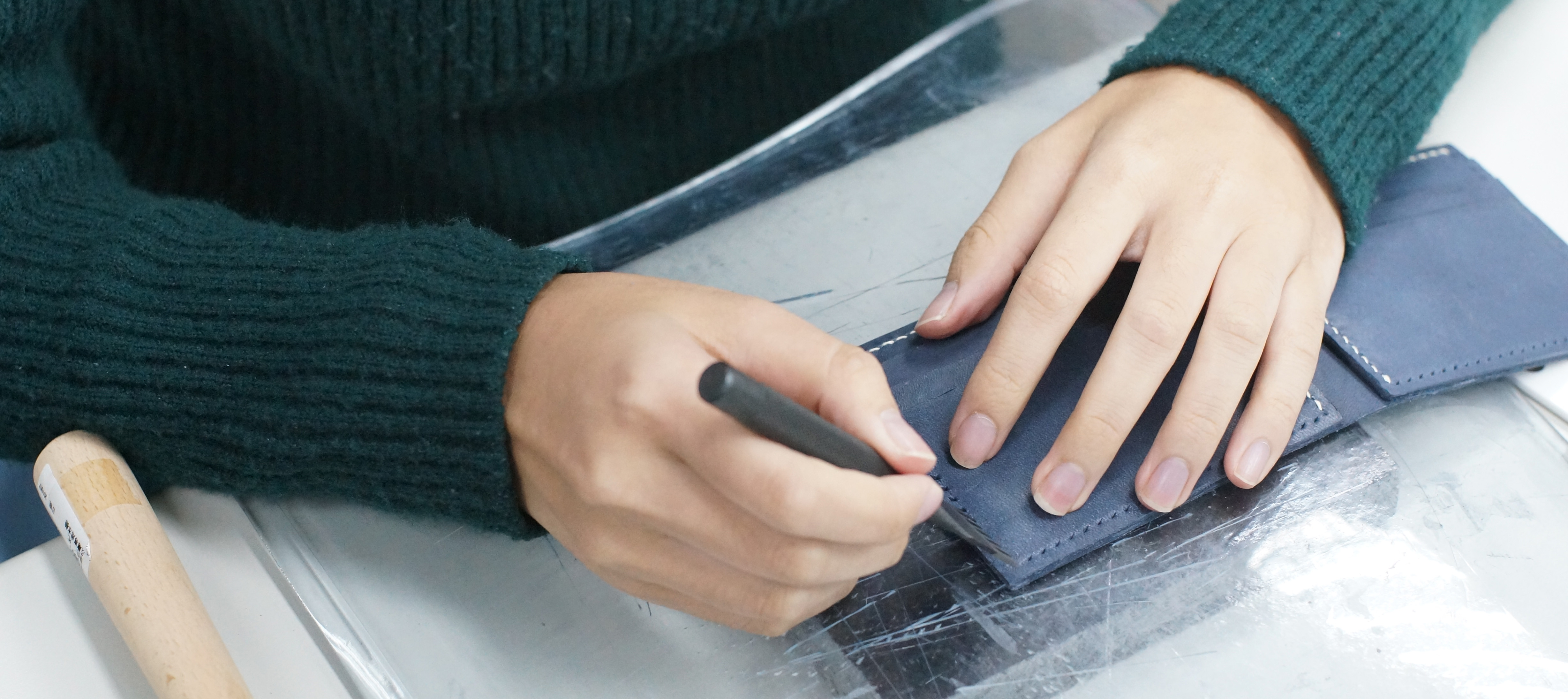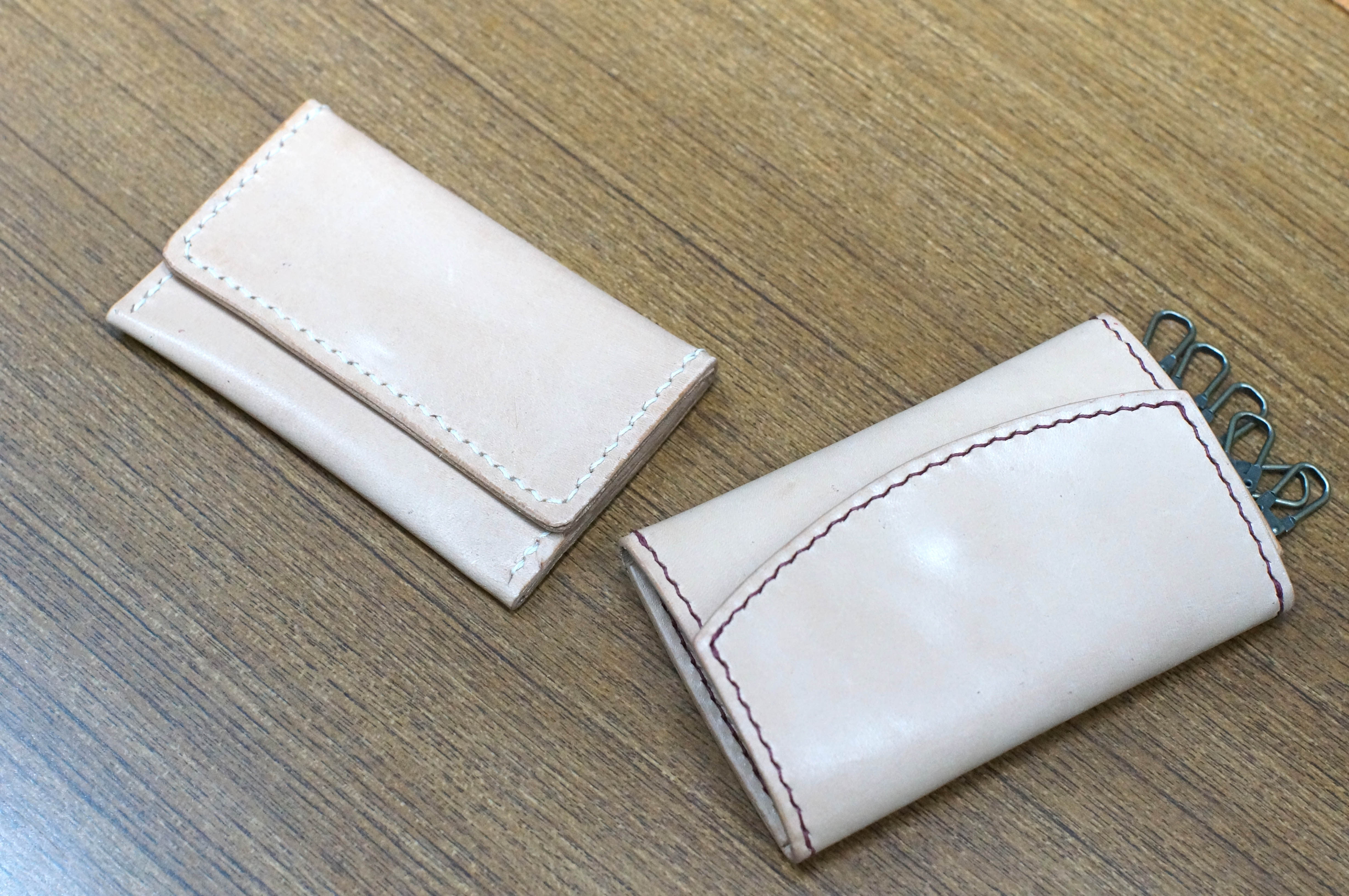 | 第二週 | 手縫皮件的技法講解及實作 I 熟悉裁切、打孔、釦具安裝及床面、邊緣處理。 作品:卡夾。 |