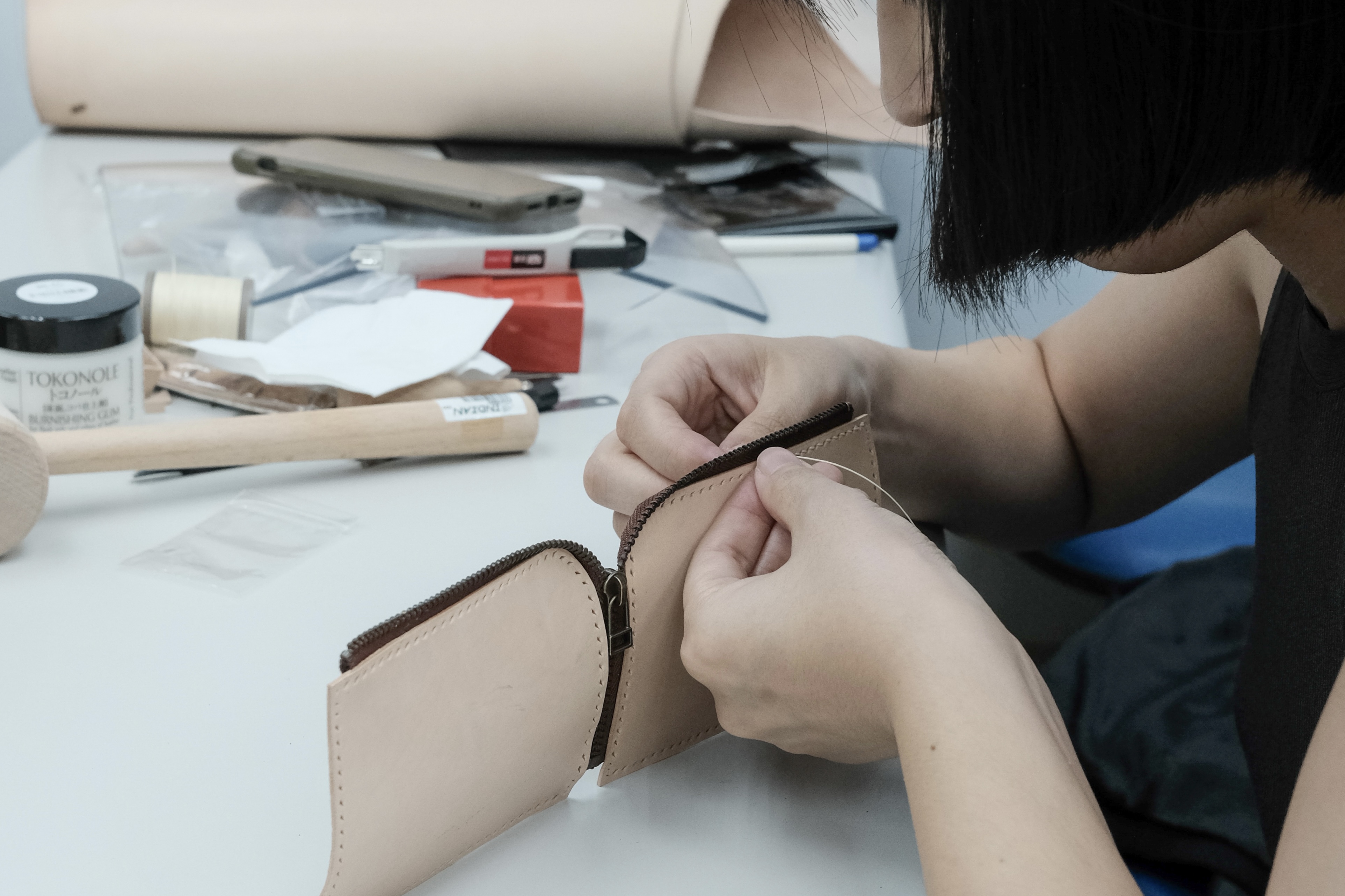 | 第三週 | 手縫皮件的技法講解及實作 II 練習弧度裁切、拉鍊貼合及轉彎折角。 作品:拉鍊零錢包。 |