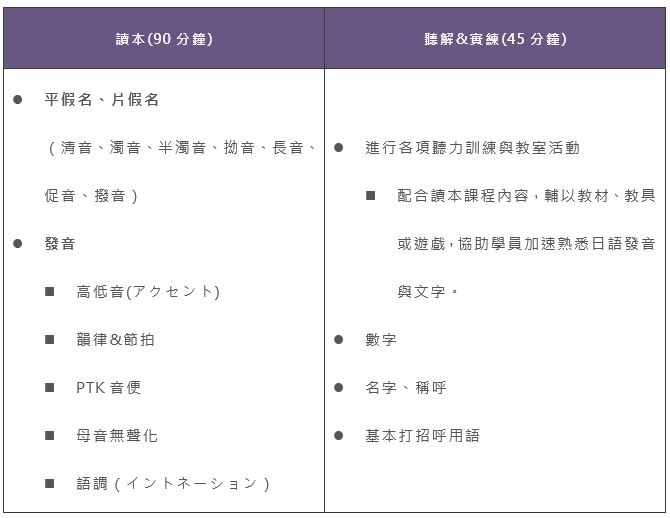由兩位老師授課:前堂為讀本課90分鐘、後堂為聽解45分鐘