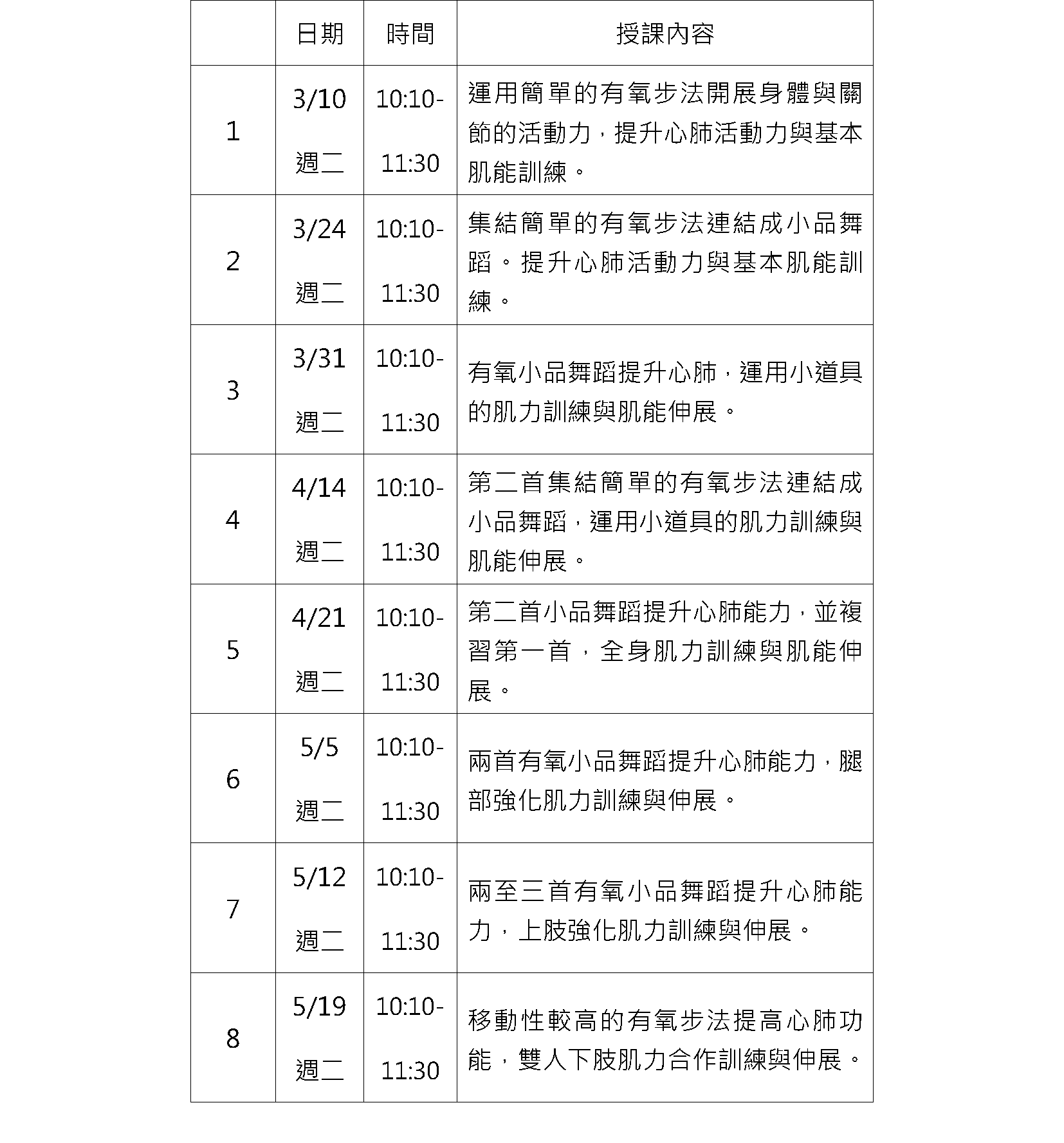 | 4/9、5/7、6/4 ( 週四 ) 10:10~12:00 5/26、6/9 (週二) 09:10~12:00 |