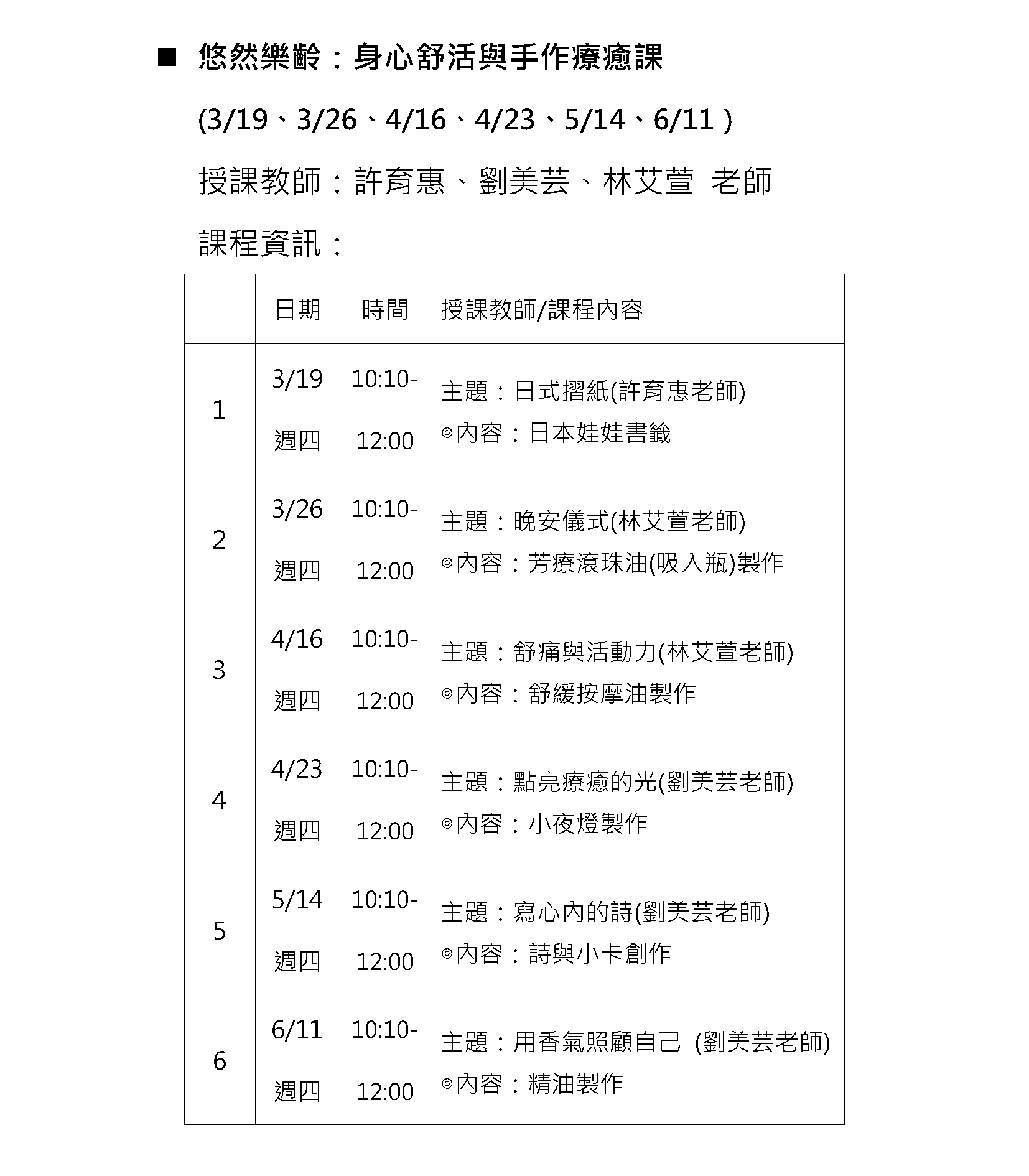 悠然樂齡:身心舒活與手作療癒課 授課老師:許育惠老師、劉美芸老師、林艾萱老師 |