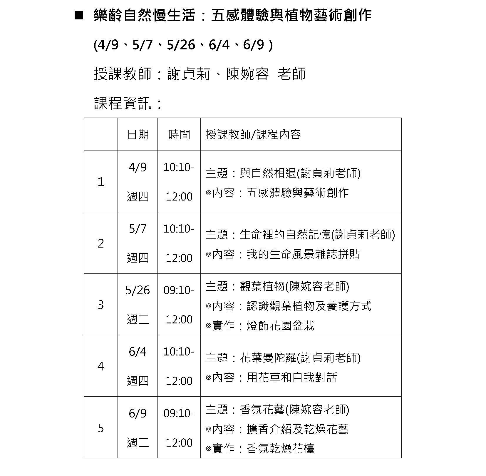 樂齡自然慢生活:五感體驗與植物藝術創作 授課老師:謝貞莉老師、陳婉容老師 |